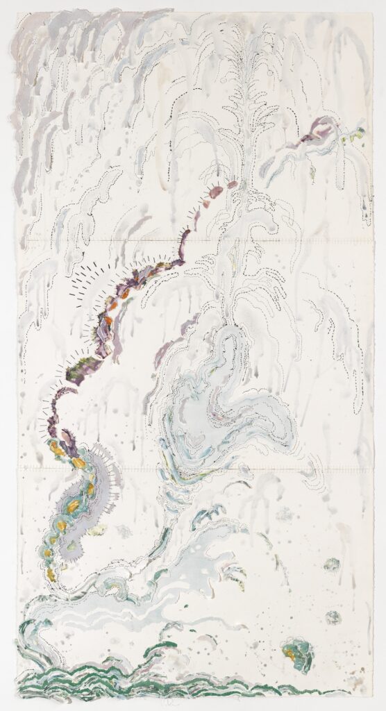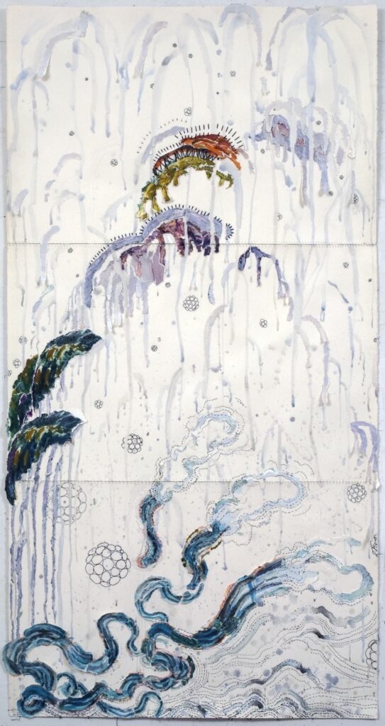 In 2006 the Proteanna Series began with an experiment. For the first time, using black embroidery thread, I tried stitching imagery into an existing watercolor I’d always felt lacking. The piece seemed to come alive. Suddenly the idea of combining stitching, watercolor and other aqueous media on larger sheets of thick watercolor paper had become entrancing. I began tearing up random, ragged fragments of my old monotypes and stitching them onto the paper. I continued stitching, painting, and layering, attaching collaged pieces strictly through stitching. This was the beginning of the ongoing Proteanna Series. I coined the word “proteanna,” derived from the word “protean,” to suggest entities and their situations straddling and crossing taxonomies, mutating beyond classification. The process is as improvisatory as nature; forms develop, morph, and reconstitute. Fragments get sewn atop fragments, creating relief surfaces that stratify. Might my grafting and hybridizing processes be likened to nature’s own irrepressibly continuous transforming?