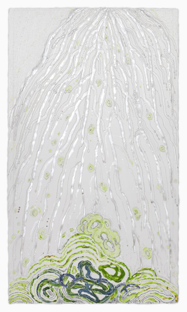 The colorful hand embroidered large scale works that define the Proteanna series are “hybrid” in nature and include a mix of older works combined with newer paintings and constructions. The texture and layering create an almost three-dimensional experience that transport the visitor into a wondrous underwater world of possibility.